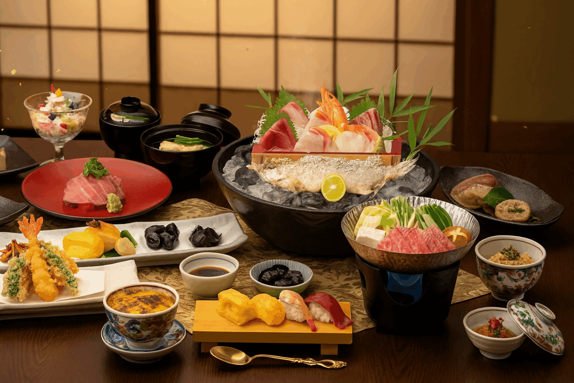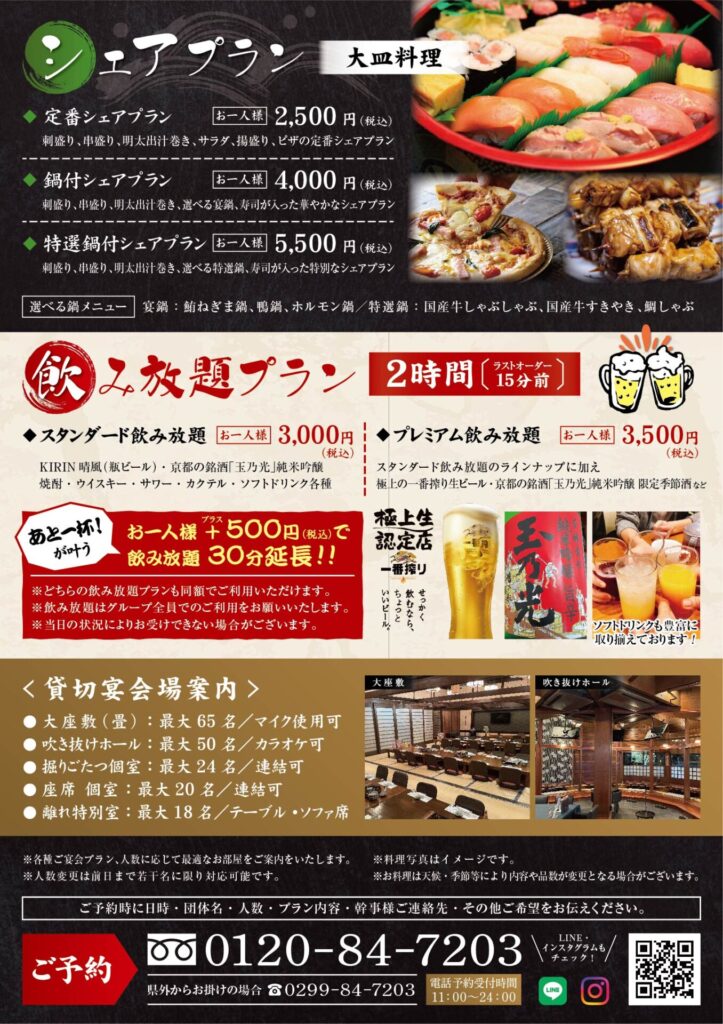 ご宴会は、3 つの宴会料理のスタイル × 3 つの価格 × 2 つの飲み放題プラン。