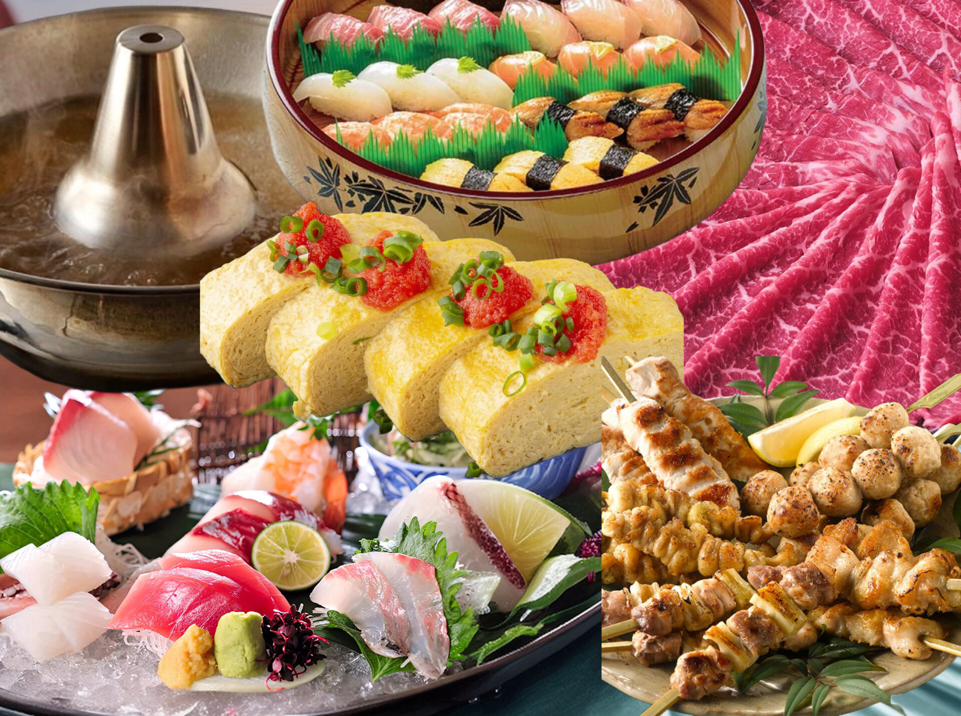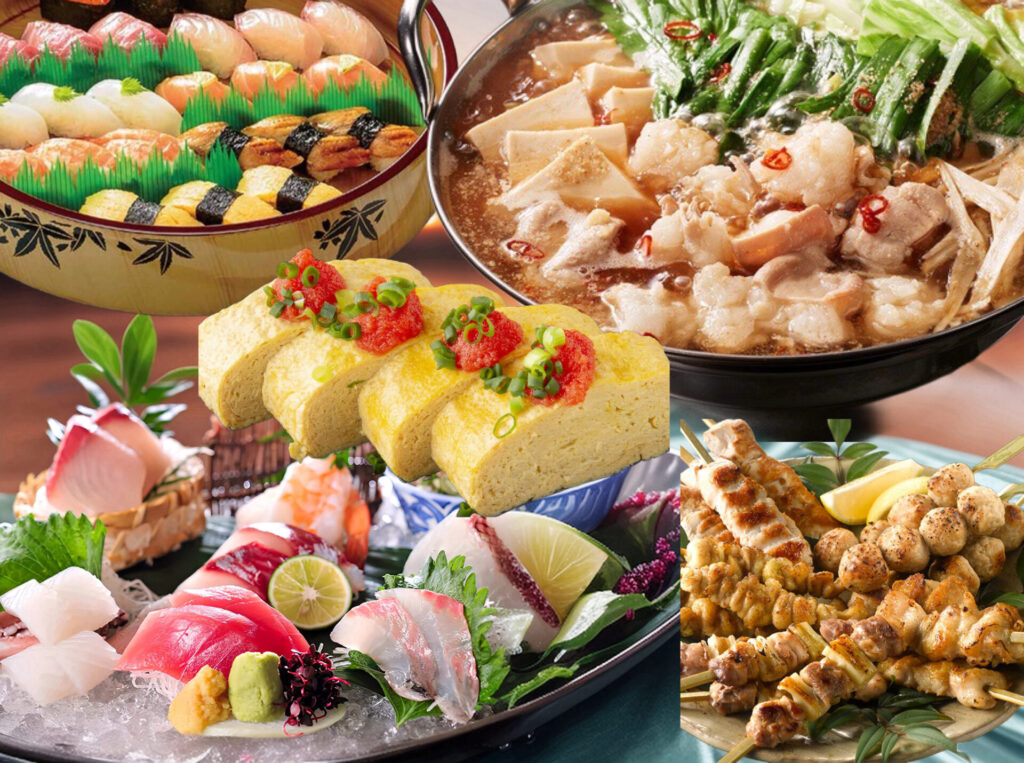 名物の明太出汁巻きと寿司が加わり、さらに鍋料理も楽しめる充実プラン。
